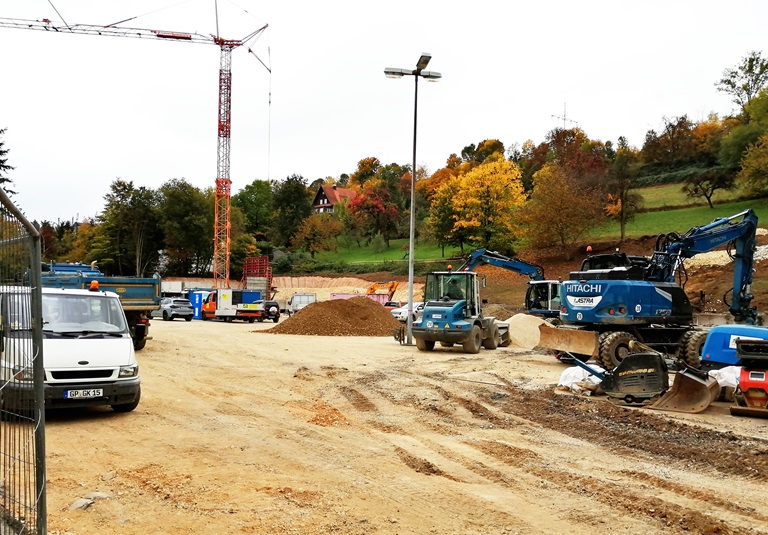 Letzte Woche haben die Erschließungsarbeiten auf dem ehemaligen Filba-Areal begonnen. Das Bürogebäude der Firma Webis und das gemeinde-eigene Gesundheitszentrum befinden sich bereits im Bau bzw. Umbau. Mit der neuen Straße wird das Gebiet erschlossen. In diesem Zusammenhang werden verschiedene Tiefbaumaßnahmen durch die Firma Astra, Schwäbisch Gmünd,