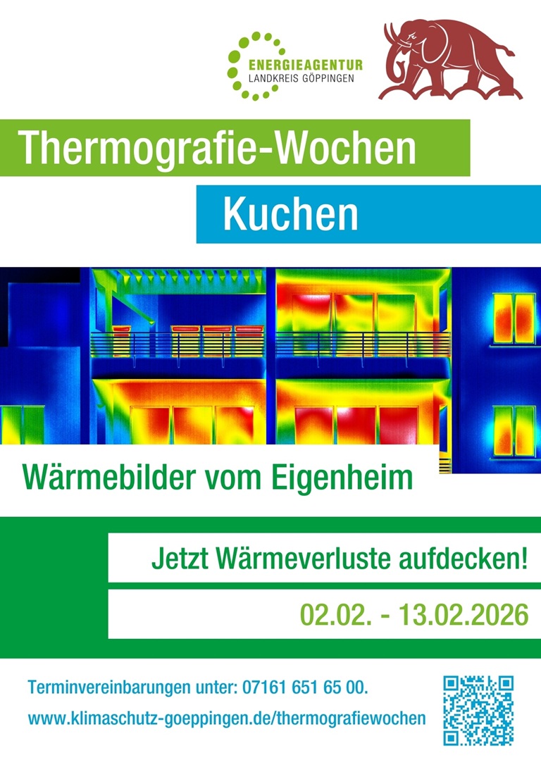 Die derzeit sehr kalte Witterung sorgt dafür, dass Heizungen vielerorts auf Hochtouren laufen. Umso wichtiger ist die Frage, ob die erzeugte Wärme auch tatsächlich in den eigenen vier Wänden bleibt. Gerade jetzt sind die Bedingungen ideal, um den energetischen Zustand von Gebäuden mit Hilfe von Thermografieaufnahmen genauer zu untersuchen. Genau diese Gelegenheit nutzt die Kommune Kuchen in Kooperation mit der Energieagentur Landkreis Göppingen im Rahmen der Thermografie-Wochen und macht anhand von Wärmebildern potenzielle Schwachstellen sichtbar. Mit einer speziellen Infrarotkamera werden die Oberflächentemperaturen von Gebäuden gemessen. Die dabei entstehenden Wärmebilder machen energetische Schwachstellen sichtbar und zeigen auf, wo Wärme und Energie an einem Haus verloren gehen. Dafür führen die Energieberater*innen zunächst selbstständig Außenaufnahmen des Gebäudes durch, um optimale Bedingungen für die Wärmemessung zu nutzen. Anschließend findet ein gemeinsamer Beratungstermin mit einer Begehung des Gebäudes statt. Dabei wird das Haus auch von innen begutachtet und bei Bedarf ergänzende Innenaufnahmen mit der Wärmebildkamera erstellt. Erste Auffälligkeiten werden direkt vor Ort besprochen. Nach Abschluss der Beratung erhalten die Hausbesitzer*innen einen ausführlichen Thermografie-Bericht sowie eine schriftliche Auswertung zum Gebäude, in denen alle Erkenntnisse übersichtlich zusammengefasst sind.Die Thermografie-Wochen findet im Zeitraum vom 02.02.2026 bis zum 13.02.2026 statt. Die Beratung kostet 89 Euro und richtet sich an Eigentümerinnen und Eigentümer von Wohngebäuden in Kuchen. Für die ersten 10 Anmeldungen übernimmt die Kommune Kuchen einen Anteil von 20 Euro, so dass sich die Kosten auf 69 Euro reduzieren. Anmeldungen sind ab sofort telefonisch bei der Energieagentur unter 07161 651 65 00 möglich.Chance nutzen: Kostenfreie Thermografie-Beratung gewinnen! Unter allen Hausbesitzer*innen der Gemeinde Kuchen verlost die Kommune eine Thermografie-Beratung für ein Wohngebäude in Kuchen im Wert von 89 Euro. Einfach bis zum 29. Januar 2026 eine E-Mail mit Namen, Adresse und Telefonnummer an bma@kuchen.de senden. Die Gewinnerin oder der Gewinner wird anschließend direkt benachrichtigt.