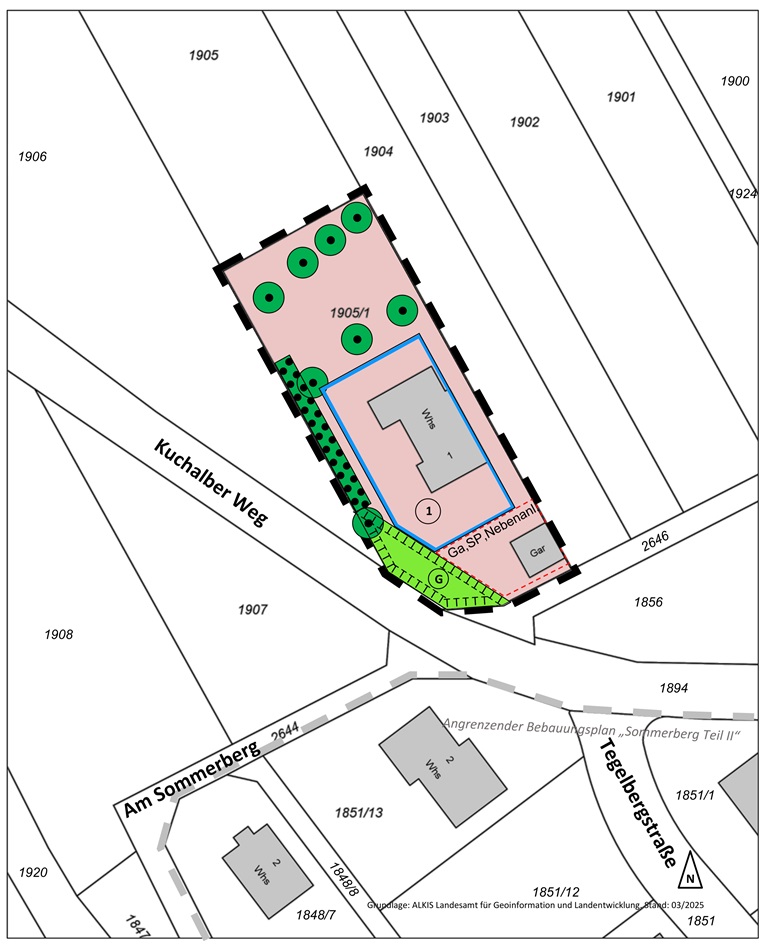 Das Plangebiet liegt nördlich des Baugebiets „Sommerberg“ welches überwiegend in den 1960er- und 70er-Jahren entwickelt und bebaut wurde. Das Plangebiet umfasst das Flurstück Nr. 1905/1 (Gänsstelle 1) und hat eine Fläche von 1.461 m². Im Süden schließt der Kuchalber Weg und darunter die Wohnbebauung des Sommerbergs an. Im Norden, Westen und Osten schließen sich Streuobstwiesen an.