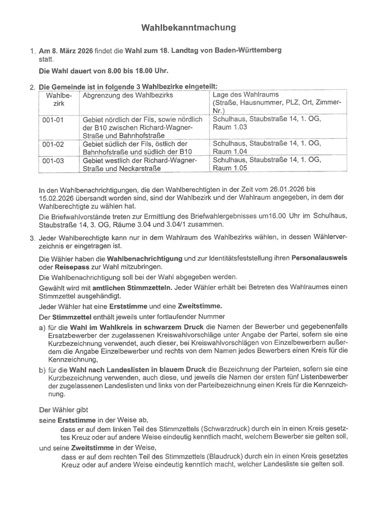 Am 08.03.2026 findet die Wahl des 18. Landtags von Baden-Württemberg statt. Die Wahlzeit dauert von 8:00 bis 18:00 Uhr. Die Wahllokale befinden sich im 1. OG des Schulhauses, Staubstraße 14, und sind rollstuhlgerecht erreichbar. Die einzelnen Wahllokale sind auf den Wahlbenachrichtigungen, die jeder Wahlberechtigte erhalten hat, aufgedruckt.