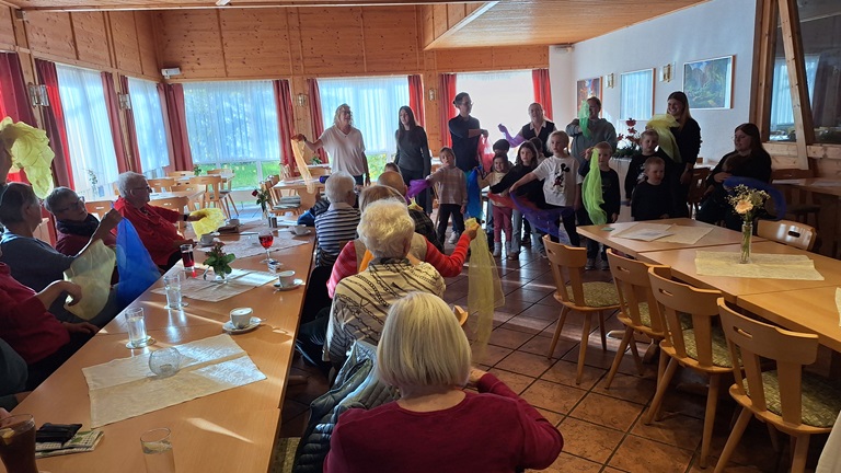 Natürlich hatten sie auch eine Überraschung „mit im Gepäck“. Sichtlich viel Spaß hatten sie beim Singen und Schwingen der Tücher und sorgten mit ihren leuchten Augen damit auch bei den Gästen für viel Freude und Abwechslung. Herzlichen Dank nochmals von dieser Stelle aus an die Kinder und Erzieher für den erfrischenden Besuch!